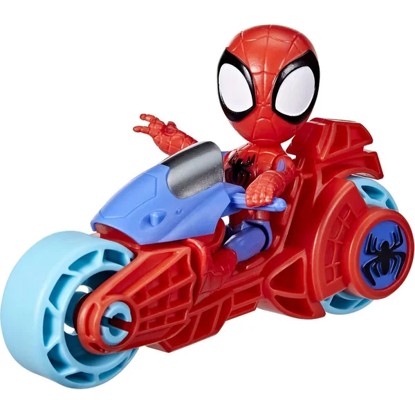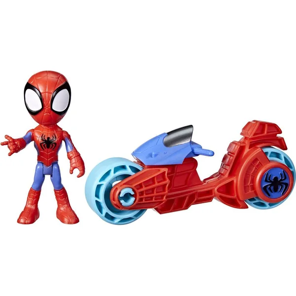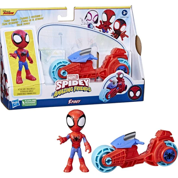 Figurine articulée de Spidey et sa moto. Issue du dessin animé Spidey et ses amis extraordiaires. Taille 10 cm.