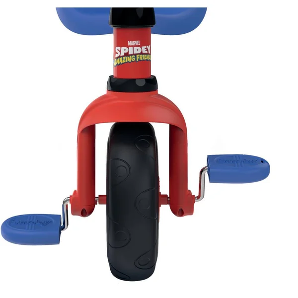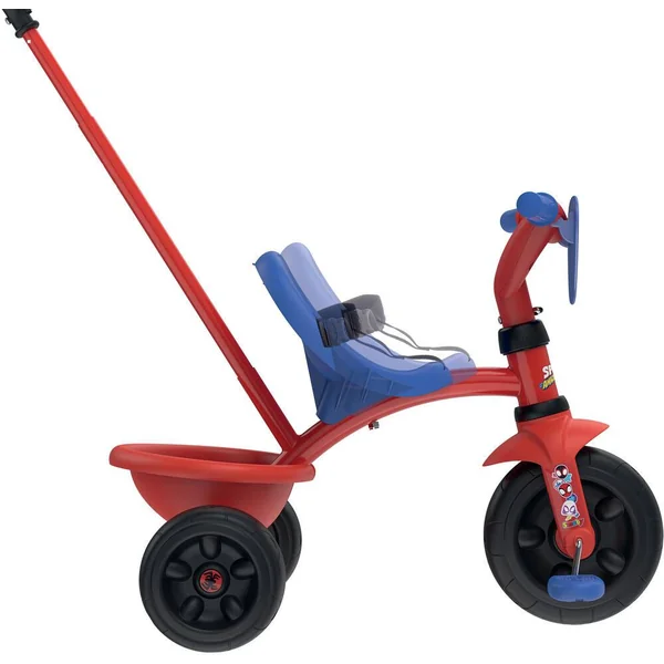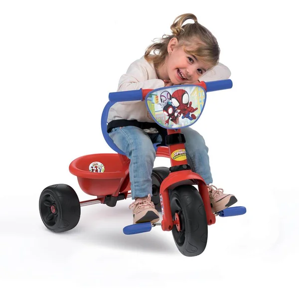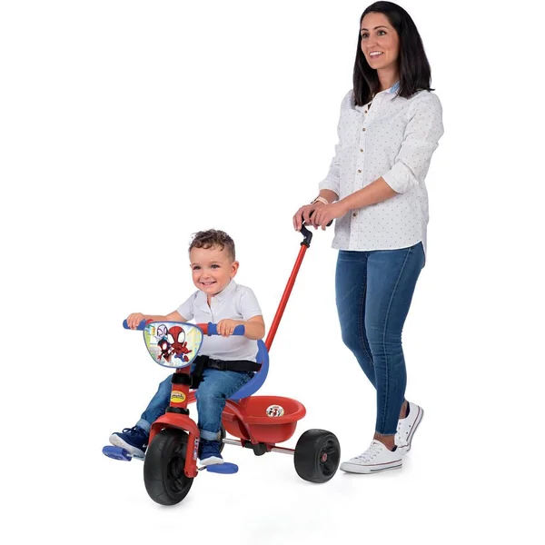 Tricycle Be Fun aux couleurs de Spidey avec une benne basculante – Tricycle évolutif accompagnant l’enfant de 15 mois à plus de 3 ans. Tricycle robuste au design ergonomique tout en rondeur – Pour la sécurité : cadre en acier, ceinture de sécurité, système roue libre et verrouillage de direction – Pour le confort : canne parentale réglable en hauteur sur 3 positions, siège enveloppant et ergonomique réglable sur 2 positions, et pédales antidérapantes –