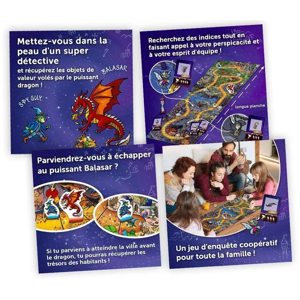 Une fois le trésor en votre possession, il vous faudra prendre vos jambes à votre cou pour rentrer rapidement au village ! En effet, le dragon Balasar vous pourchassera, progressant rapidement grâce à ses ailes et aux raccourcis du plateau. Sa vitesse dépendra des cartes posées, ajoutant une tension croissante au fil des tours. Si le dragon vous rattrape, la mission échoue. Arriverez-vous au village avant lui ? Nombre de joueurs 1 à 4. Durée de la partie 30 minutes.