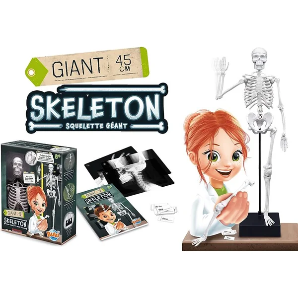 Le kit d’expérimentation pour enfants comprend un modèle de squelette humain d’environ 45 cm de haut avec des accessoires (socle, étiquettes pour identifier les os individuels, radiographies).