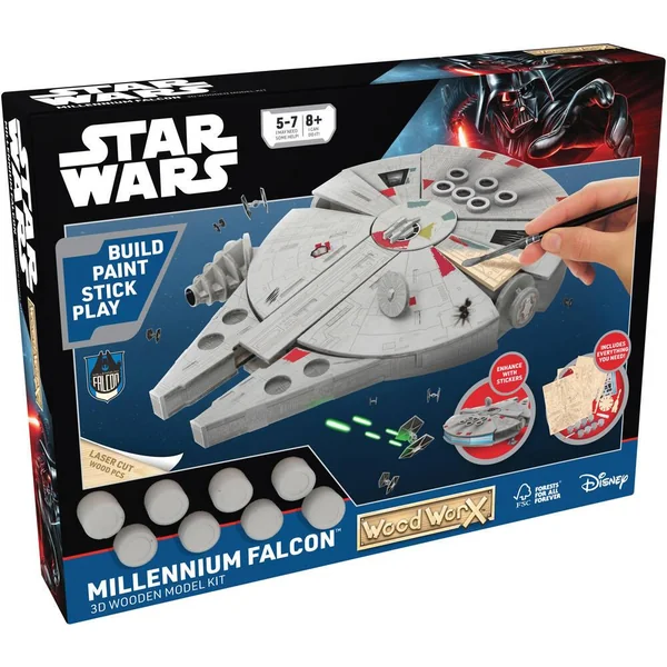 Créé ton propre vaisseau Faucon Millénium grâce aux pièces de bois incluses. Grâce à la feuille d’instruction qui te guide étape par étape réalise très facilement tes maquettes puis personnalise-le avec la peinture et les stickers pour plus de réalisme.