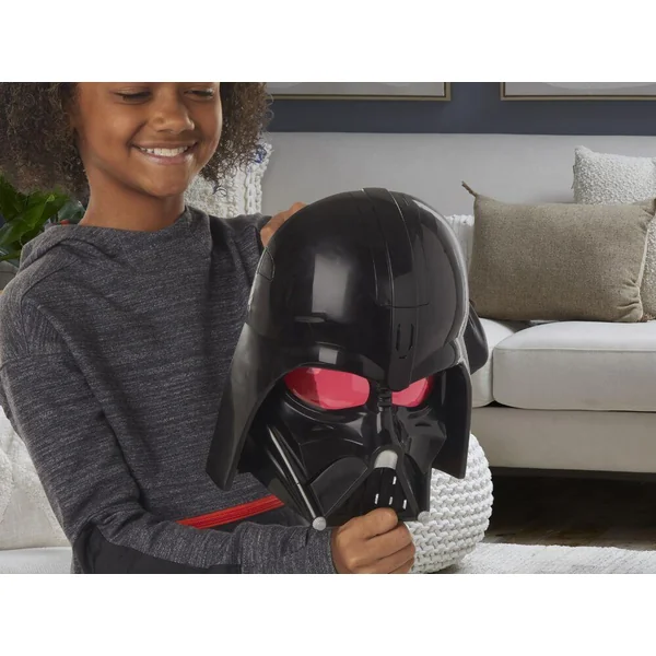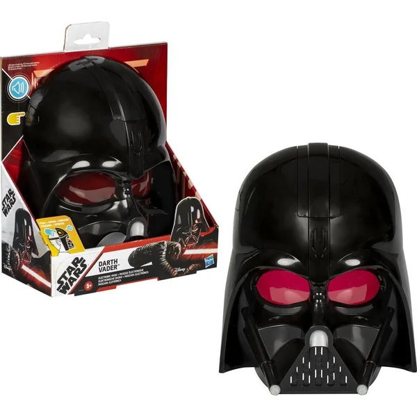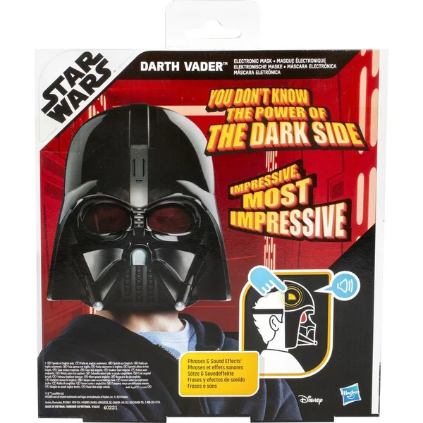 Masque électronique de Dark Vador : Ce masque Star Wars, inspiré du casque de Dark Vador, offre la possibilité de vivre des aventures du côté obscur de la Force. Phrases et effets sonores : On n’a qu’à presser le bouton situé sur le côté du masque pour écouter des effets sonores et des répliques.