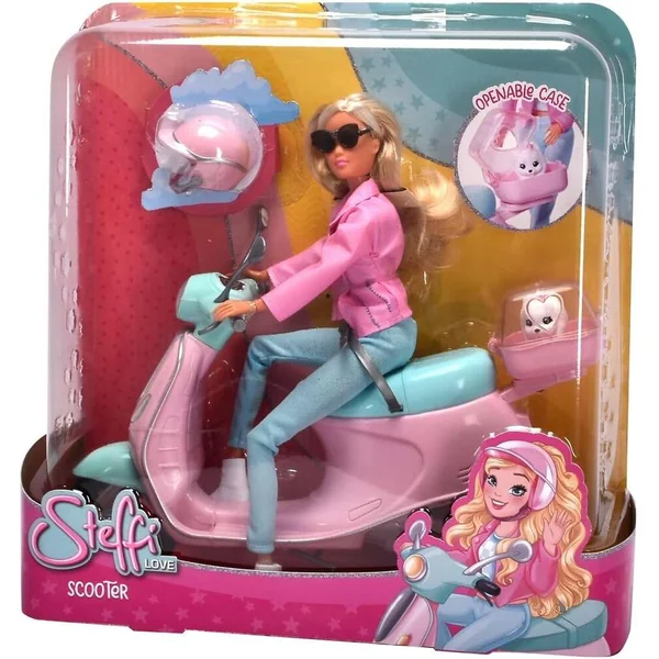 Steffi part en balade avec son scooter. Elle porte une tenue à la mode, un casque, des lunettes de soleil cool et un blazer rose.