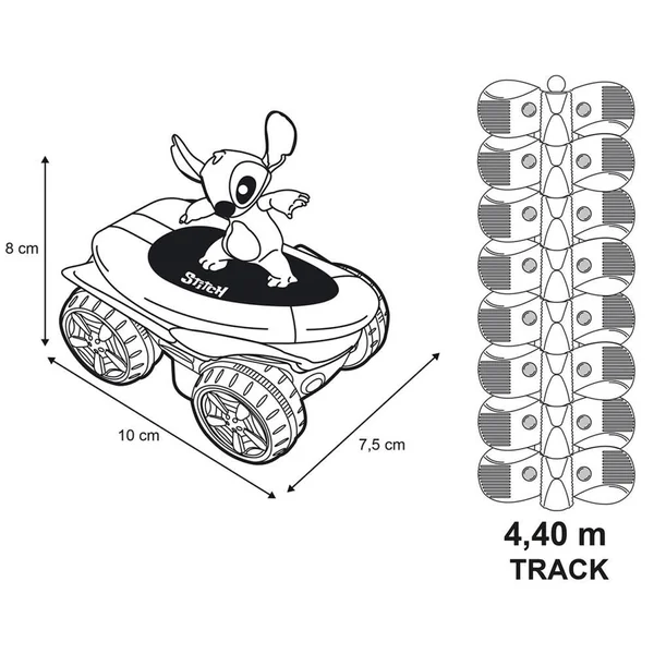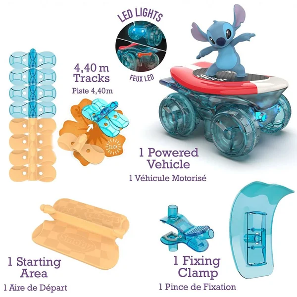 L’univers FleXtreme permet aux enfants de créer un circuit en assemblant les pièces les unes aux autres.Avec Stitch FleXtreme, les enfants peuvent réaliser le circuit le plus incroyable possible grâce à leur créativité et à l’environnement qui les entoure.Les pistes s’emboitent facilement et sont tellement flexibles que l’enfant peut faire passer ses pistes au-dessus d’une chaise, de son lit, ou encore de sa commode. Mais pas seulement ! Looping, à l’envers, sur le côté…Ce set découverte aux couleurs de Stitch est composé de 184 pistes soit un circuit flexible de 4 mètres 40, d’un véhicule Stitch électronique lumineux, d’une pince de fixation avec un support type vague et d’une piste d’entrée/sortie.Piles incluses.