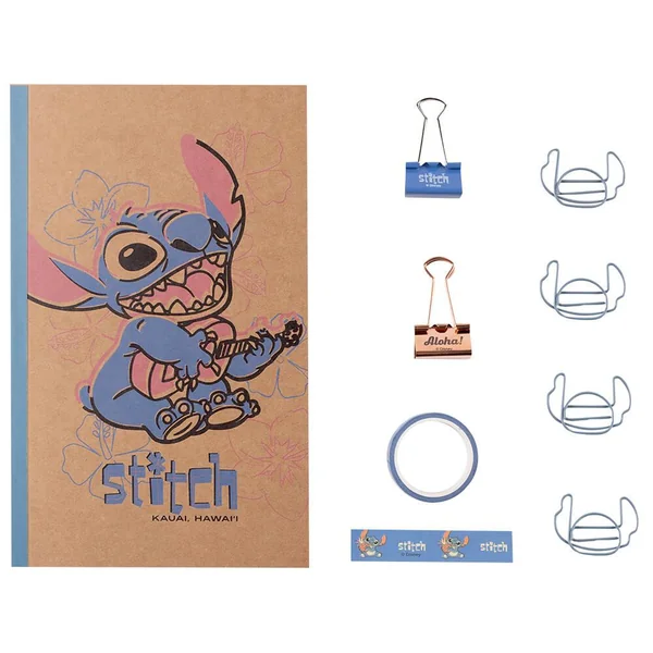 Ce set comprend un carnet de format A5, 2 clips à pince, un stylo, 4 clips à formes et un ruban adhésif décoratif. Le tout est en mode Stitch.
