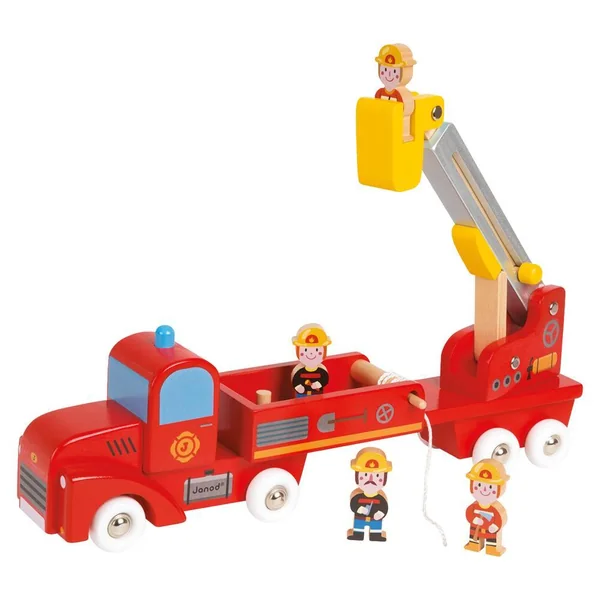 Véritable camion de pompiers équipé d’une lance à incendie et d’une échelle télescopique et rotative. Livré avec 4 pompiers de la gamme Story. Bois : pin. Impression par transfert à chaud sur le camion et les pompiers.