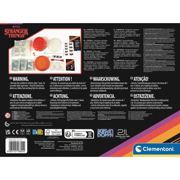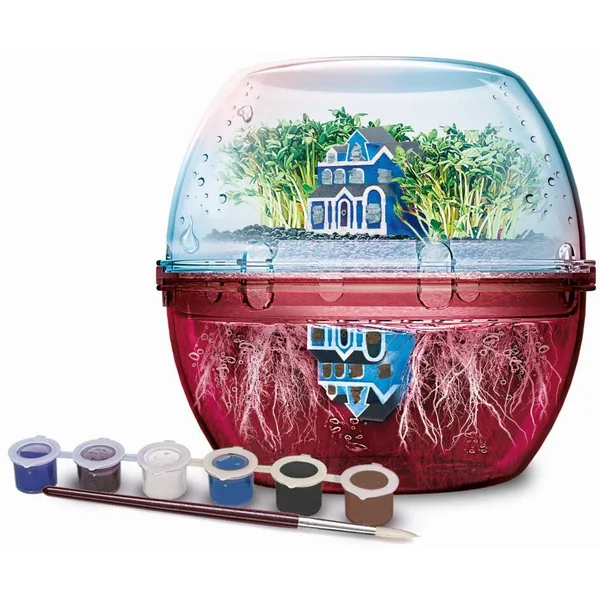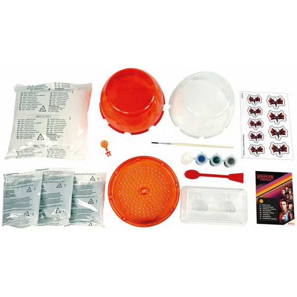 Recrée la maison effrayante de Vecna et le monde à l’envers avec ce coffret, qui mélange botanique et chimie ! La culture se fait en hydroponie, les racines poussant progressivement jusqu’à plonger dans le fond rouge rempli d’eau. Pour changer l’eau, les plateaux sont amovibles (terre et couvercle). La petite maison immergée à l’envers peut être réalisée avec un moule coloré tandis que la petite maison dans les airs peut être réalisée avec du plâtre puis colorée à la détrempe.