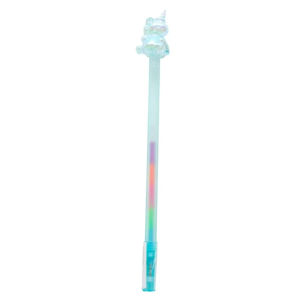 Stylo licorne translucide à encre gel multicouleur changeante à mesure de l’utilisation du stylo. Pointe fine de 0,38 mm pour une écriture fluide.
