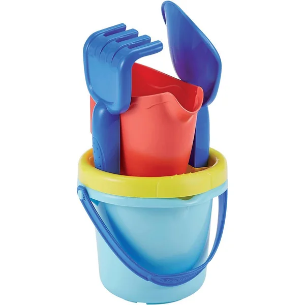 Petit seau conçu spécialement pour les 12 mois et + avec un tamis, un arrosoir, une pelle et un râteau.