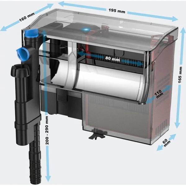 Ce filtre suspendu peut être utilisé pour des aquariums d’un volume de 38 à 115 litres. La puissance de la pompe est de 500 l/h.