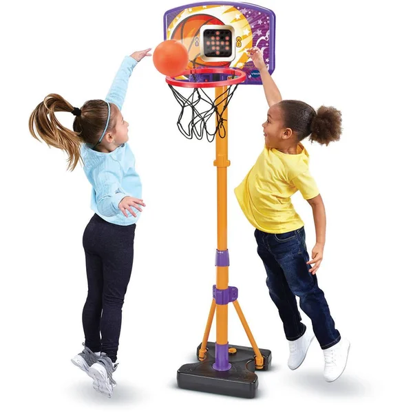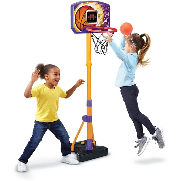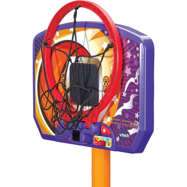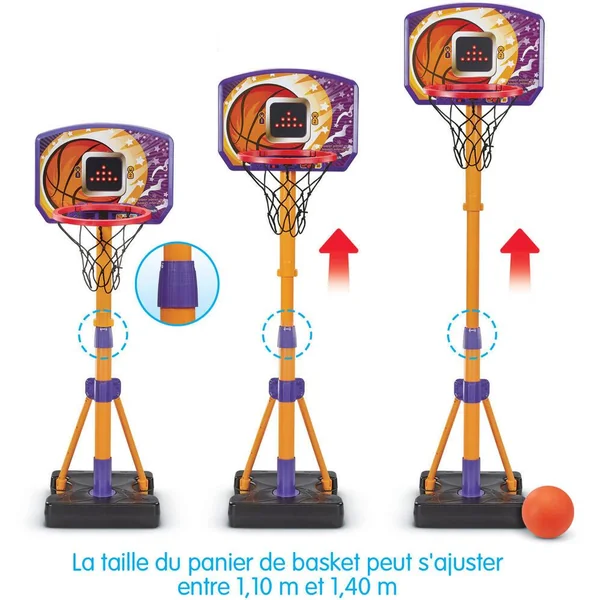Super panier de basket interactif – 3 ans + Un panier de basket ajustable et pensé pour les juniors pour marquer des paniers tout en s’amusant ! Ballon en main, un dribble, deux dribbles et c’est parti ! L’enfant s’élance pour atteindre le panier et c’est gagné ! Il marque et prend l’avantage ! 3 modes de jeu interactifs : Jeu libre avec différents thèmes, accompagné d’une musique et d’effets sonores. Challenge des tirs : en suivant les indications, le joueur doit tirer sur les objets qui s’affichent sur l’écran LED. Lancers francs : les joueurs doivent marquer un maximum de paniers en 60 secondes. Possibilité de jouer seul ou en duo. Pour s’adapter à la taille de l’enfant, la hauteur du panier est évolutive et se règle entre 108 cm et 141 cm. Pour garantir la stabilité, lester la base avec de l’eau ou du sable. Pour accompagner le jeu, un écran LED sur le dessus du panier affiche des animations et s’illumine en rythme avec les effets sonores. Le panneau est détachable pour laisser la base dehors au besoin. Le panier est destiné à être utilisé en intérieur, il est malgré tout résistant à la pluie. Un ballon de Basketball est inclus. Arrêt automatique et réglage du volume sonore. Fonctionne avec 3 piles LR6 fournies.