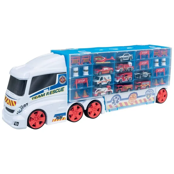 27 pièces au total. Camion transporteur en plastique contenant 10 véhicules de secours Die-Cast (en métal et plastique). Le camion peut contenir jusqu’à 44 véhicules. Compatible avec tous les véhicules à l’échelle 1/64ème, d’une longueur maximale de 7.5 cm. Véhicules roues libres. Contient aussi 16 accessoires : plots et panneaux de signalisation. Transporte tous les véhicules facilement ! Camion roues libres avec une poignée rétractable. Set de jeu complet pour secourir.