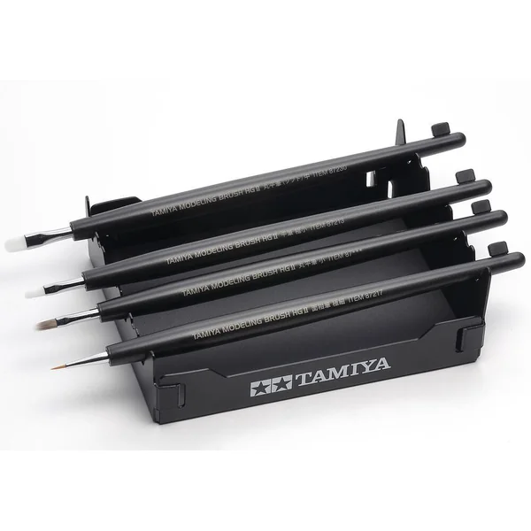 Support à pinceaux de modélisme TAMIYA. Support à pinceaux en polypropylène. Dimensions : 85 x 105 x 35 mm (après assemblage). Les capuchons de protection peuvent être rangés en toute sécurité à l’intérieur du plateau. La hauteur du support à pinceaux est plus basse vers la pointe du pinceau, afin d’éviter que la peinture ne coule sur le manche. Des palettes d’une hauteur maximale de 12 mm peuvent être placées sous les pointes des pinceaux pour receuillir les gouttes. Utiliser l’autocollant antidérapant Tamiya vendu séparément (réf. 87227).