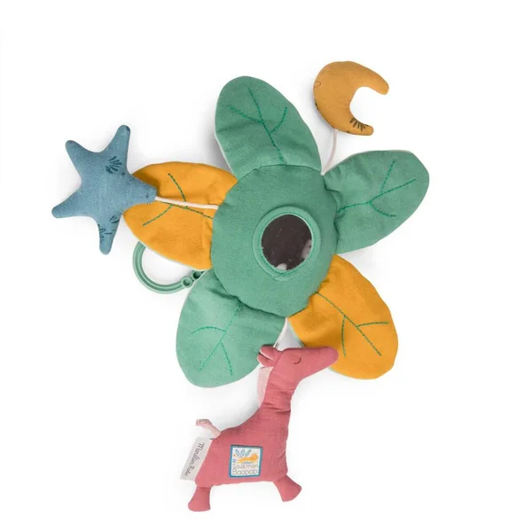Suspension feuilles d’activités au jeu de couleurs, textures et motifs variés. Bébé va s’amuser avec les feuilles qui font scritch, l’étoile qui fait pouët. La lune et la girafe contiennent chacune un grelot. Il y a même un miroir pour y voir son reflet.
