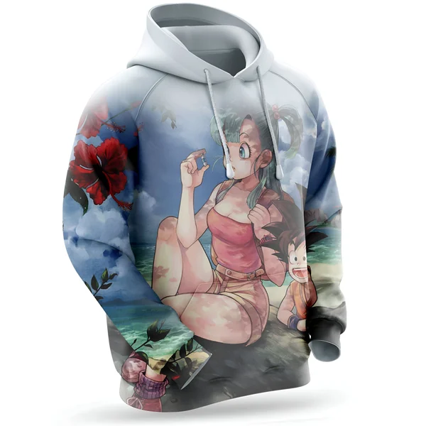 Ce sweat à capuche vous transporte à l’époque des débuts de Dragon Ball. L’illustration saisit l’instant précis où Bulma, avec sa curiosité scientifique légendaire, et le jeune Goku, alors ignorant du monde extérieur, se rencontrent pour la première fois. La scène illustre la douceur des rivages, avec des touches de fleurs tropicales. Cette rencontre fortuite est l’étincelle qui allume l’aventure, un récit rempli d’humour et de péripéties. Ce vêtement est un clin d’œil à ces premiers épisodes.