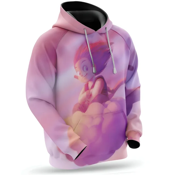 Ce sweat représente le jeune Goku, cheveux au vent, sur son fidèle nuage Kinto-Un. L’illustration, dans des tons doux et pastel, rappelle les premiers épisodes de la saga Dragon Ball, une période où l’aventure et l’innocence étaient les maîtres-mots. La pose de Goku, pleine d’entrain, est caractéristique de son tempérament de combattant espiègle. Chaque détail, de son expression faciale à son regard pétillant, a été soigneusement pensé pour ravir les fans de la première heure. Ce sweat est bien plus qu’un simple vêtement, c’est un voyage dans le temps.