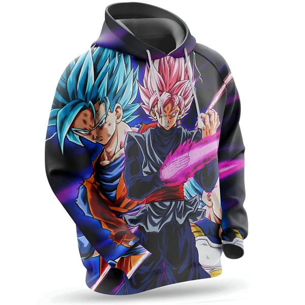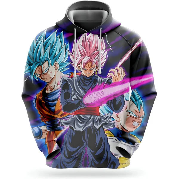Ce sweat capture l’essence même de la tension qui règne lors des confrontations les plus intenses de Dragon Ball Super. On y retrouve Goku Black, vêtu de sa tenue sombre et auréolé de son aura rose, prêt à en découdre. Son visage concentré et déterminé témoigne de sa puissance redoutable, tandis que Goku et Vegeta, dans leurs transformations Super Saiyan Blue, se tiennent prêts à riposter. Les couleurs vives et les détails soignés de l’impression donnent vie à ce moment emblématique de la série. Ce n’est pas juste un design ; c’est un récit visuel qui raconte une partie de l’histoire de Dragon Ball Super.