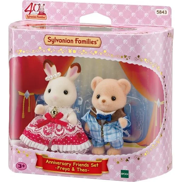 La célébration du 40e anniversaire nécessite une tenue de gala. L’ensemble comprend deux figurines de fille en vêtements de fête – le lapin en chocolat Freya et l’ours Theo. Freya porte un diadème en perles et une magnifique robe rouge et blanche ornée d’un nœud et d’un diamant. L’ours Theo porte un smoking bleu à motif écossais, un gilet et un nœud papillon bleu. Il s’agit d’une édition spéciale de figurines pour célébrer le 40e anniversaire de Sylvanian Families.