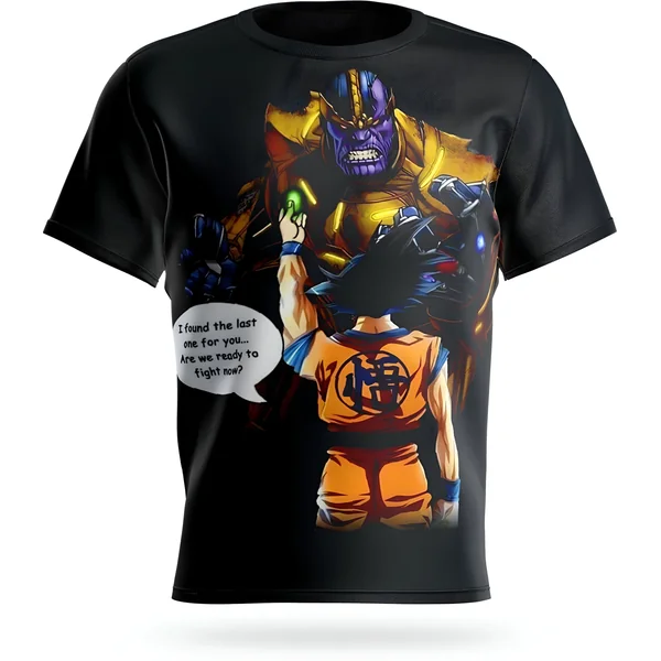 Chaque élément a été pensé pour faire de ce vêtement une pièce de collection. Le dialogue inscrit ajoute une touche narrative et plonge celui qui le porte au cœur de l’action. L’attention portée aux détails, des armures imposantes de Thanos à la posture déterminée de Goku, témoigne d’un savoir-faire et d’une passion pour ces deux mondes. Ce t-shirt est plus qu’un simple vêtement, c’est une porte d’entrée vers un affrontement que beaucoup ont rêvé de voir.