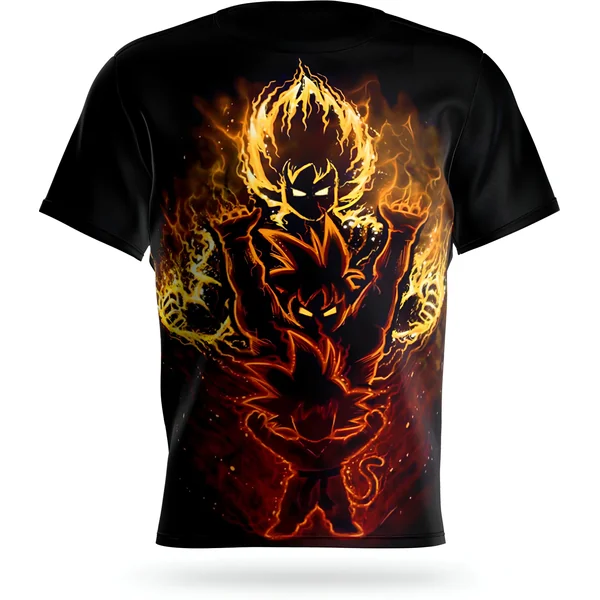 Le design de ce T-shirt retrace l’évolution de Goku, depuis son apparence enfantine jusqu’à sa forme la plus puissante. Chaque silhouette, imprégnée d’une énergie ardente, témoigne des combats acharnés et des entraînements rigoureux qui ont forgé le guerrier Saiyan que nous connaissons. Les flammes qui les entourent symbolisent la passion et la détermination qui animent Goku à chaque instant. Cette représentation stylisée est une véritable œuvre d’art qui ravira les fans de la première heure comme les nouveaux venus dans l’univers de Dragon Ball.