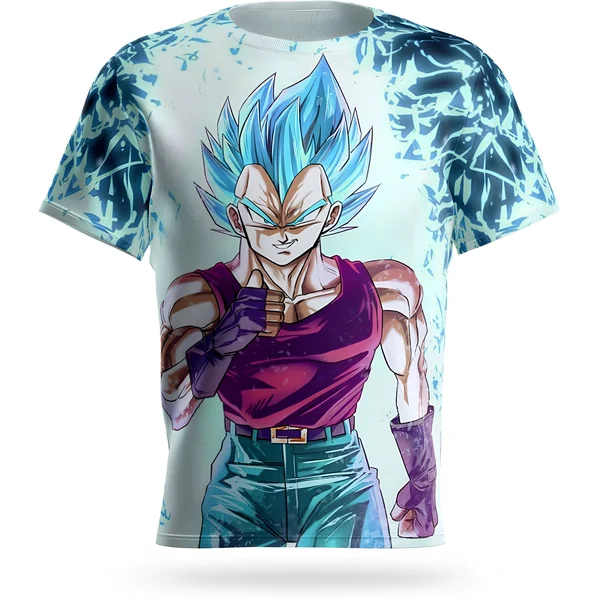 Ce t-shirt met en scène Vegeta dans sa transformation Super Saiyan Blue, une forme qui symbolise sa quête de puissance et sa rivalité avec Goku. L’impression de haute qualité restitue fidèlement les détails de son expression déterminée, ses cheveux d’un bleu intense et son aura énergétique. Le motif enveloppe le t-shirt, offrant une expérience visuelle immersive, presque comme si Vegeta se tenait prêt au combat à vos côtés. Ce n’est pas qu’un simple vêtement, c’est un hommage à l’un des personnages les plus emblématiques de Dragon Ball Super.