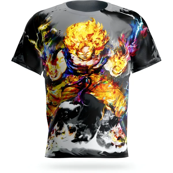 Ce t-shirt ne se contente pas de représenter Goku; il incarne l’essence même de sa puissance. L’artiste a magnifiquement capturé la rage qui anime Goku lors de ses transformations en Super Saiyan. La flamme dorée, les éclairs qui l’entourent et l’expression farouche de son visage traduisent un sentiment d’énergie brute. Ce t-shirt deviendra bien plus qu’un simple accessoire vestimentaire, c’est une projection de votre propre passion pour l’univers de Dragon Ball.