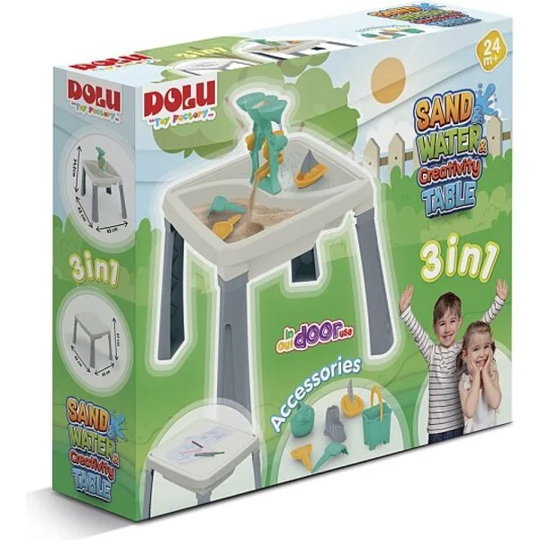 La table est adaptée à une utilisation intérieure et extérieure. En assemblant le plateau supérieur, qui sert à écrire et dessiner, une surface de jeu pour jouer avec de l’eau ou du sable est créée. Remplissez les gobelets d’eau, versez-les dans l’entonnoir supérieur et regardez l’eau faire tourner les pales de la roue à eau et tomber en cascades.
