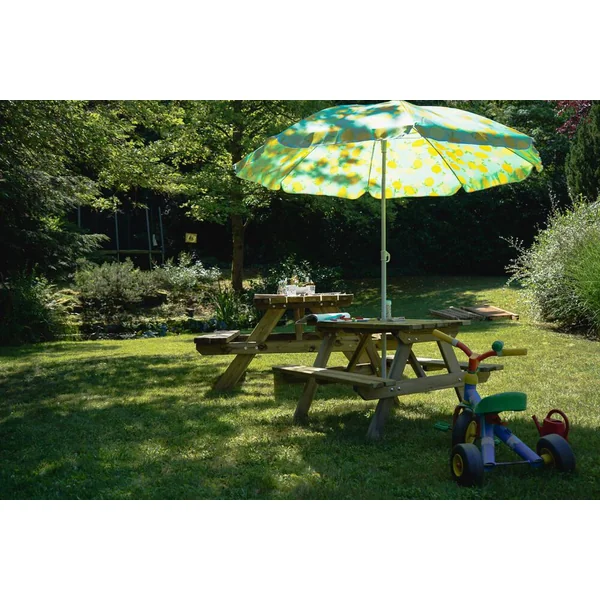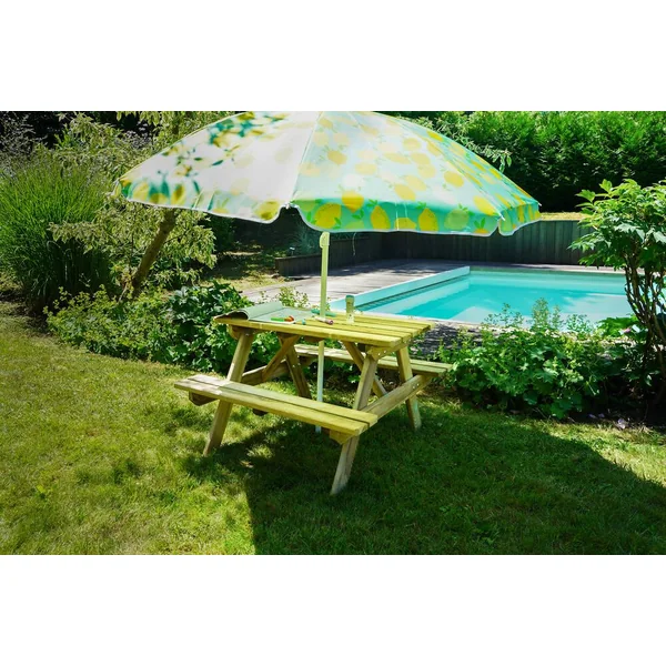 Table pique-nique pour enfants, idéale pour offrir aux enfants leur propre espace, faire comme les grands et le trou central pour le parasol permet de pouvoir se protéger du soleil. 1 table Longueur 90 x largeur 41,5 x hauteur 57 cm avec 2 bancs longueur 90 cm x largeur 15,5 x hauteur 34 cm. Trou parasol diamètre 3,5 cm. Epaisseur 2,6 cm. En bois certifié : pin traité autoclave classe 3. Notice de montage incluse. Parasol non fourni. Réservé à un usage familial. Utilisation en extérieur. Poids maximum supporté par banc 70 kg.
