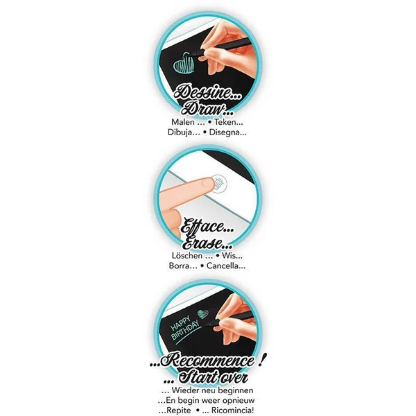 Ecris, dessine ou prends des notes sur la tablette à dessin avec écran LCD. Pour écrire, il suffit d’utiliser le stylet comme un stylo. Pour effacer, il suffit d’appuyer sur le bouton ! La tablette ne pèse que 100g et se transporte facilement. Dimensions: 22×14,5 cm. Nécessite une pile CR2016 incluse.