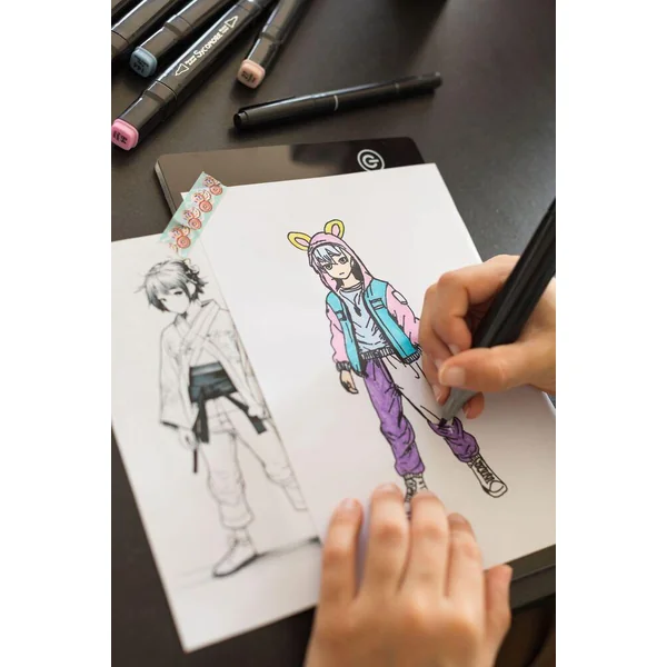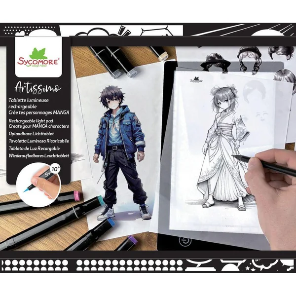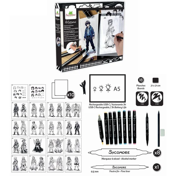 Contenu : 1 tablette lumineuse A5 avec batterie intégrée : pratique, légère et portable, avec 3 niveaux d’intensité lumineuse, 10 papiers layout A5, parfaits pour vos esquisses et mises en couleur, 18 planches de modèles pour développer vos personnages et affiner vos idées, 8 feutres à alcool pour des rendus professionnels et des dégradés impeccables, 1 fine liner pour les détails et contours précis, 1 crayon HB, 1 gomme et 1 notice d’instructions.