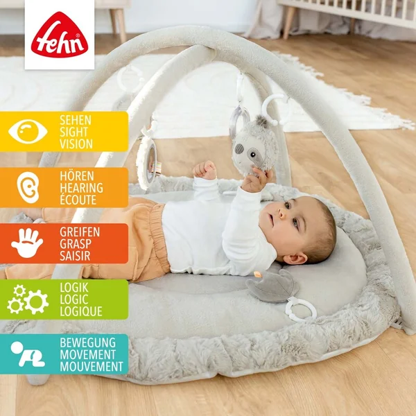 Tapis interactif avec paresseux et espace de couchage en divers matériaux doux invite le bébé à câliner, explorer et jouer. Trois éléments amovibles avec papier bruissant, sifflet et hochet sur le tapis favorisent la perception tactile et la coordination main-œil.