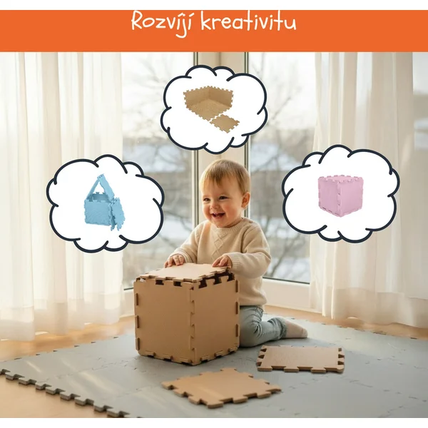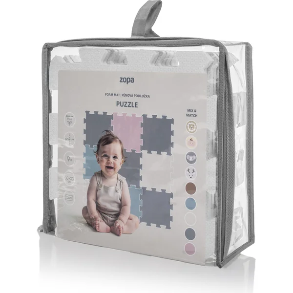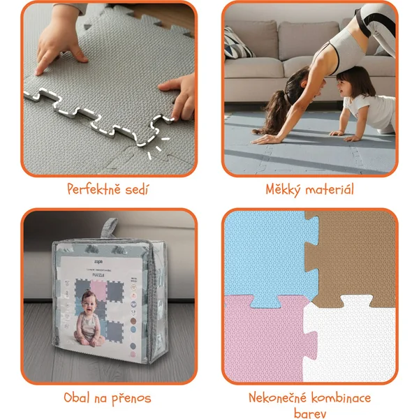 Les dalles individuelles de 30 × 30 cm (9 pièces) s’emboîtent parfaitement. Le tapis est adapté aux enfants dès la naissance, fabriqué à partir de matériaux non toxiques et agréables.