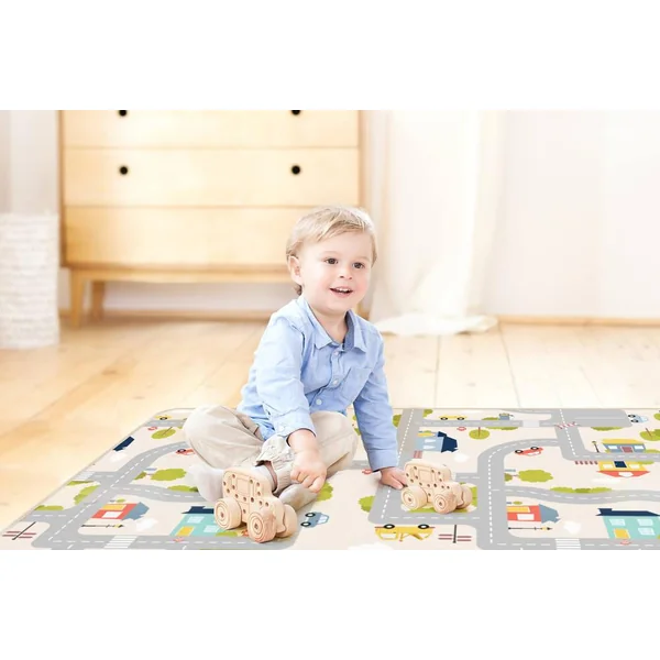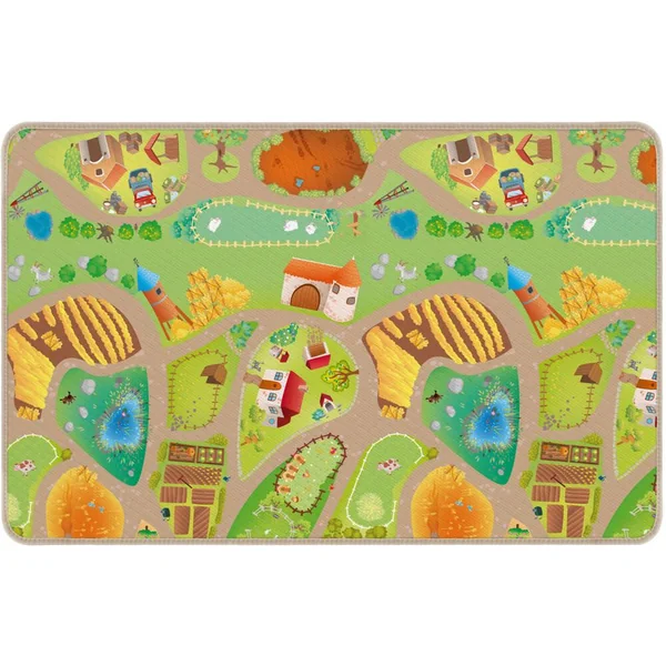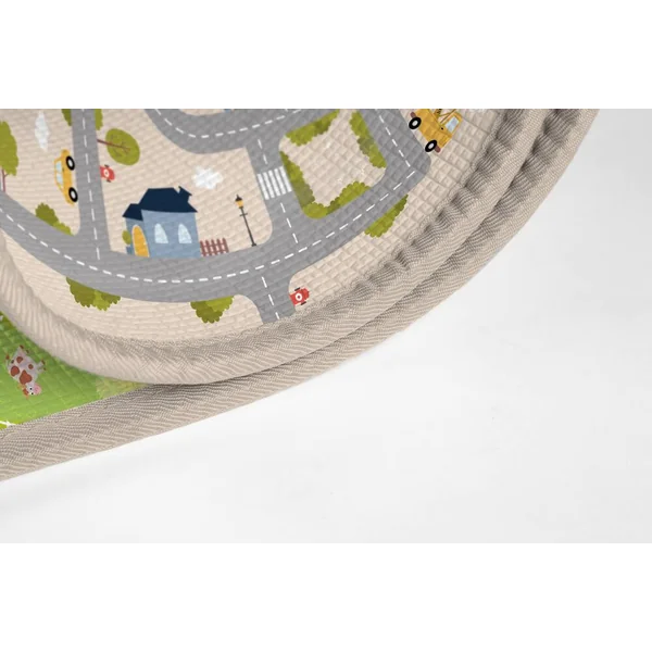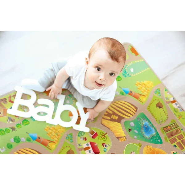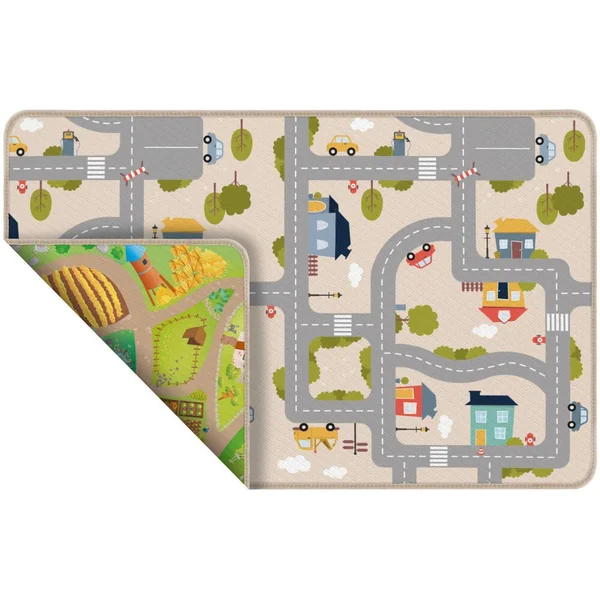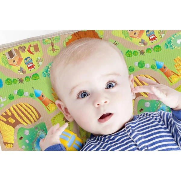 Imprimée des deux côtés elle offre une double surface de jeux (ville et ferme) Sa matière facilite le déplacement des jouets (voitures, personnages, …) mais également le déplacement de votre enfant sur le produit. Utilisation polyvalente. Ce tapis est idéal pour les filles comme pour les garçons. De par sa taille moyenne, 98 x 150 cm, ce tapis isolant permettra à votre enfant de faire ses premiers pas en toute sécurité. Il est également parfait pour la protection du sol, les exercices de gym, tapis de pique-nique … Intérieur extérieur.