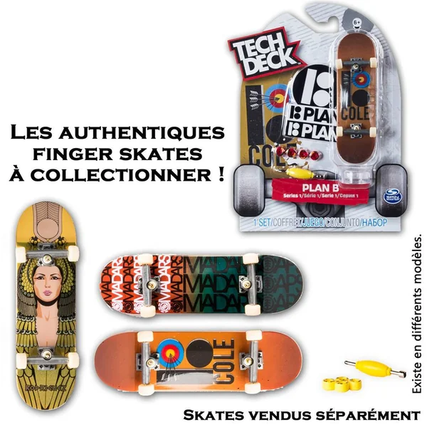 Le skate revient à la mode ! Tech Deck, ce sont des mini skates et des rampes ultra qualitatifs dans l’esprit « street » : « skate anywhere ». Tous les skates ont un design authentique fidèle aux modèles réels sous licence : Toy machine, Krooked, DGK, Baker skateboards, Grizzly Griptape, Cliché, Enjoi… Le skateur fabrique son skate et le personnalise. Il assemble le grip et les roues grâce à l’outil multifonction inclus. Pour chaque skate, les grips et les roues possèdent un design de licence. Les mini skates sont collectionnables et il existe un système de rareté : courant / rare / ultra rare. Contenu : 1 mini skate, 4 sur élévateurs, 4 vis et 4 écrous, 4 roues, 1 outil et des autocollants.
