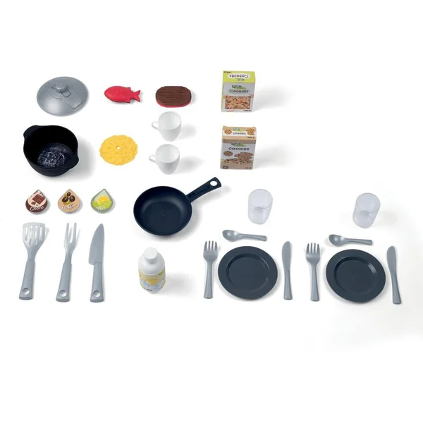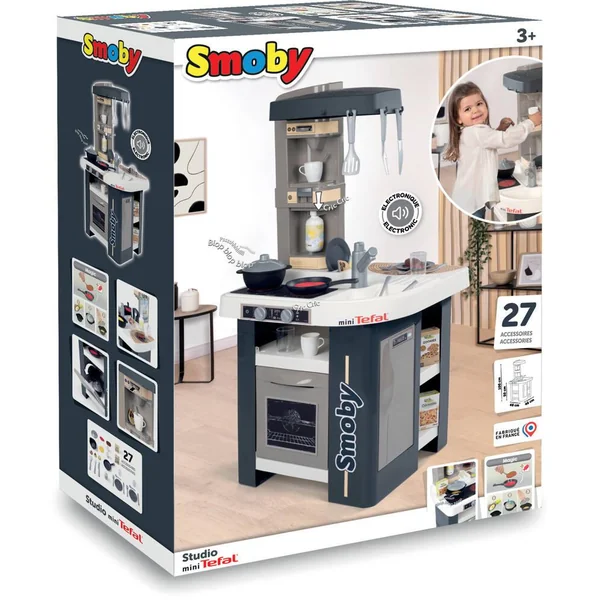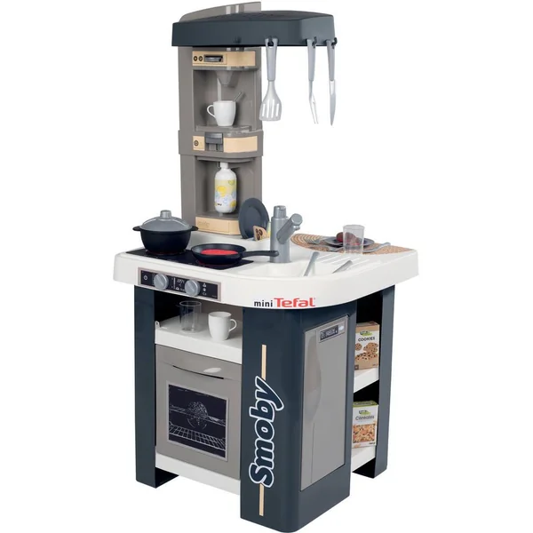 Cuisine Tefal avec une grande surface de jeu à 360° et de nombreuses fonctionnalités pour les enfants à partir de 3 ans. Module électronique avec effets sonores (bruits de cuisson) – Elle est composée de : 1 plaque de cuisson, 1 hotte, 1 évier, 1 frigo, 1 four, 1 machine à espresso à capsules, 1 machine à soda, et de divers rangements – 27 accessoires inclus : 3 ustensiles barbecue, 2 fourchettes, 2 couteaux, 2 cuillères, 2 assiettes, 2 verres, 2 tasses, 3 capsules à café, 1 soda, 1 poêle, 1 faitout, 1 couvercle faitout, 2 boites factices, des pâtes, 1 poisson et 1 steak magiques – Fonctionne avec 2 piles LR03 non incluses – Hauteur plan de travail: 50 cm –