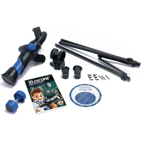 Le télescope est monté sur un trépied en métal de 89 cm de hauteur, appelé montage azimutal. Le manuel contient 15 activités pour vous familiariser avec le télescope ainsi qu’avec les objets d’observation possibles.