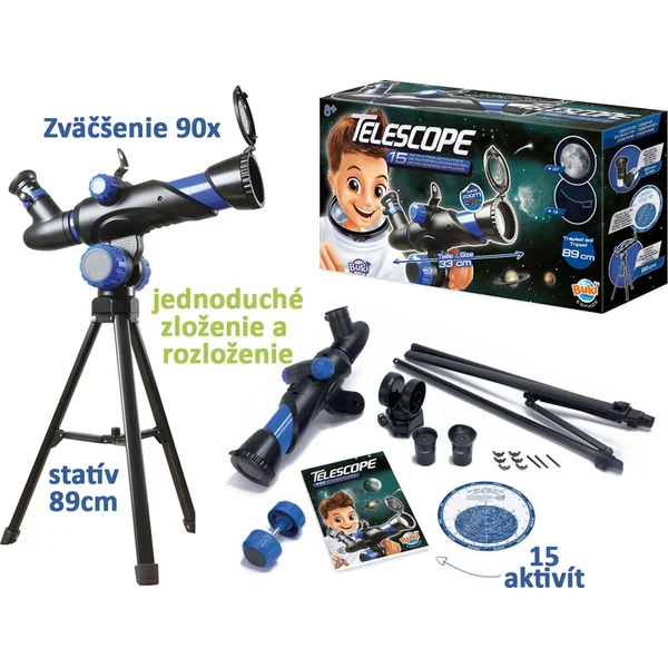 Ce télescope à lentilles pour enfants, d’une longueur de tube de 33 cm et d’un grossissement maximum de 90x, peut être dirigé vers le ciel nocturne, mais aussi vers des cibles terrestres.