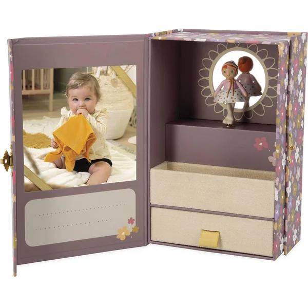 Cette belle boîte à musique de 18,6 cm avec sa jolie danseuse à l’effigie de la poupée Valentine, est idéale pour bercer bébé sur la mélodie du Lac des Cygnes. Élégant et doux, ce joli écrin permet d’y déposer tous ses objets précieux. Personnalisez la boîte à votre guise en y ajoutant une photo et un petit mot !