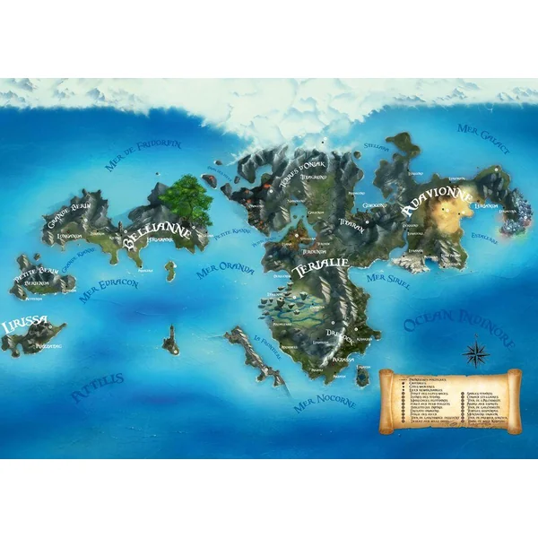 Carte des Terres-Dragons avec frontières géographiques, politiques et lieux remarquables. Carte de 60x40cm roulée sous carton.