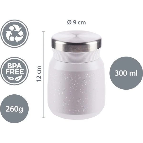 Une thermos de haute qualité pour les aliments et les collations d’une capacité de 300 ml maintiendra les aliments chauds jusqu’à 12 heures et les aliments froids jusqu’à 24 heures. Elle est fabriquée en acier inoxydable de qualité, résistant à la corrosion. Le couvercle hermétique garantit que la thermos ne fuit pas. Grâce à l’isolation sous vide, la thermos ne chauffe pas à l’extérieur lorsqu’elle est remplie de contenu chaud.