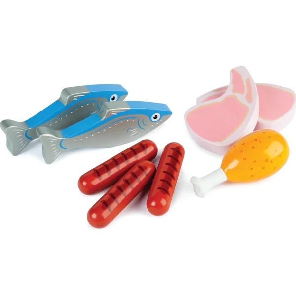 Un excellent jouet pour jouer aux commerçants ou aux cuisiniers, le set comprend 2 poissons, 2 côtelettes, 3 saucisses et 1 cuisse de poulet. Un excellent moyen d’apprendre aux enfants l’importance d’une alimentation saine et équilibrée, ainsi que d’où vient la nourriture et comment la préparer. Chacun des morceaux est arrondi et idéal pour les petites mains d’enfants.