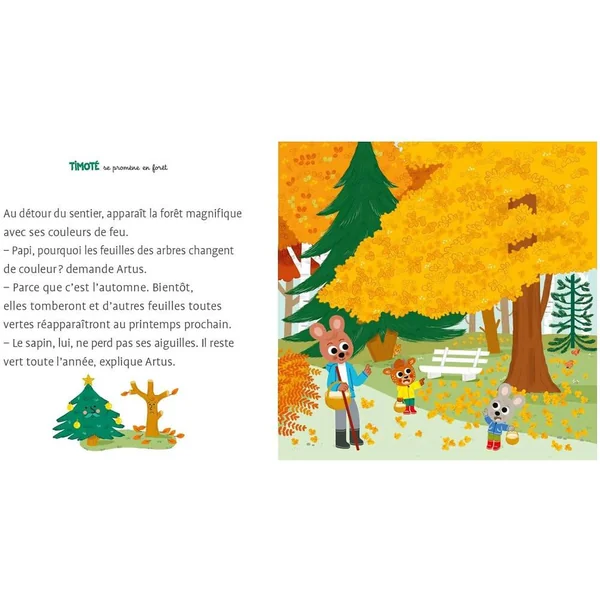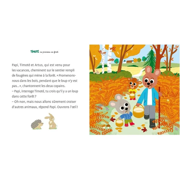 Timoté est un petit lapin qui, au fil des albums, partage sa vie avec ses copains et sa famille.Aujourd’hui, c’est en famille qu’il part pour une grande balade en forêt. Que de choses à découvrir ! les noms des arbres, la cueillette des champignons, le ramassage des feuilles mortes et, si on est très attentif, si on ne fait pas trop de bruit, on peut même voir des animaux sauvages et entendre le chant des oiseaux !Quelle belle journée ! Nouveau : votre enfant peut désormais écouter gratuitement la version audio de l’histoire via l’application Lizzie en scannant le QR code à retrouver dans le livre !