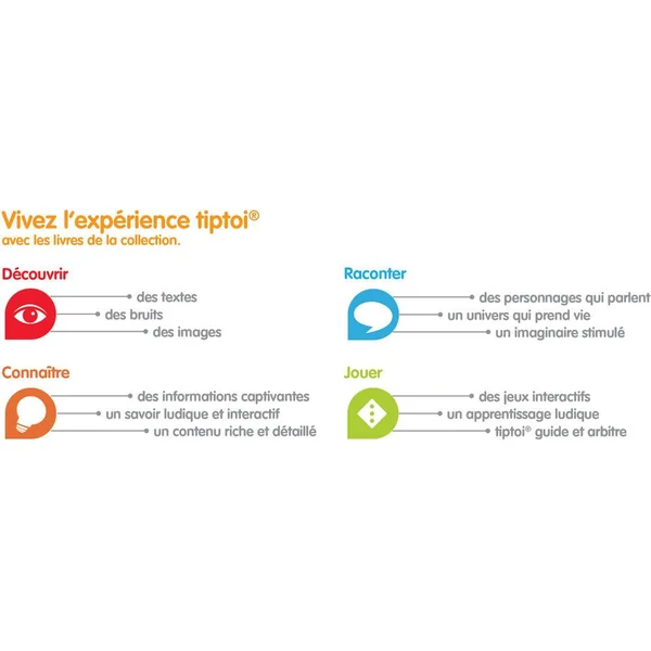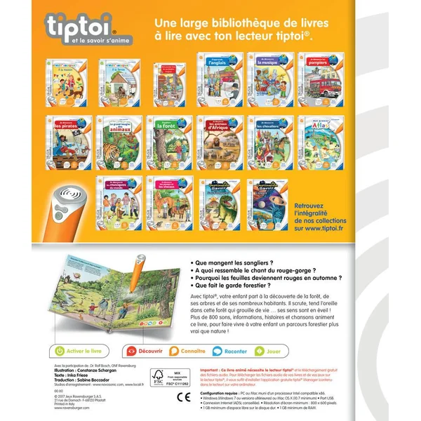 Que mangent les sangliers, Pourquoi les feuilles deviennent rouges en automne ? Avec tiptoi®, l’enfant part à la découverte de la forêt,de ses arbres et de ses nombreux habitants . Plus de 800 sons, informations, histoires et chansons animent ce livre, pour faire vivre à l’enfant un parcours forestier plus vrai que nature. ‘Je découvre la forêt’ est un livre interactif accessible dès 4 ans. Fonctionne uniquement avec le lecteur tiptoi®, vendu séparément. tiptoi® est un lecteur éducatif interactif qui permet aux enfants de découvrir le monde de facon ludique et autonome. Lorsque l’enfant pointe le lecteur sur une image ou un texte, il entend des sons, des informations, des personnages ou de la musique. tiptoi® apporte une dimension nouvelle au contenu pédagogique des supports : que ce soit dans les livres, les jeux ou le globe, l’enfant n’a qu’à pointer le lecteur dessus et tout s’anime comme par magie ! La collection de livres interactifs tiptoi® Qui ? Pourquoi ? Comment ? répond de manière adaptée aux questions essentielles des enfants. Les informations factuelles sont expliquées en fonction de l’âge des enfants et validées par des spécialistes. Ce produit est composé de matériaux issus de forêts bien gérées certifiées FSC®, de matériaux recyclés et de matériaux issus d’autres sources contrôlées (FSC-C111262).