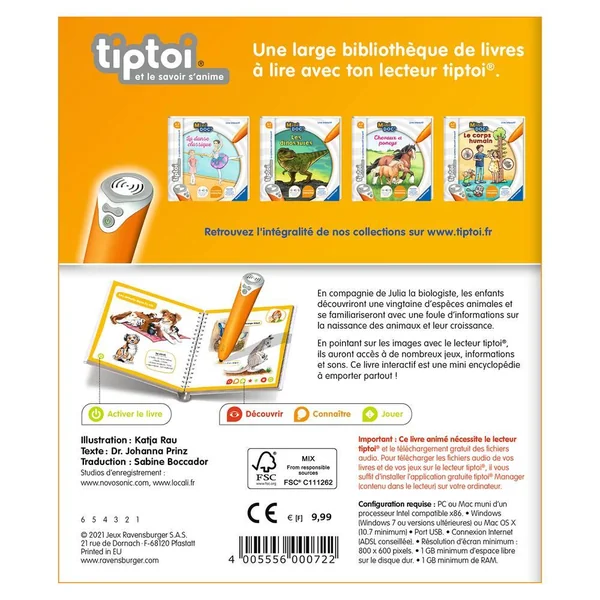 En compagnie de Julia la biologiste, les enfants découvriront une vingtaine d’espèces animales et se familiariseront avec une foule d’informations sur la naissance des animaux et leur croissance. Ce livre interactif est une mini encyclopédie à emporter partout !