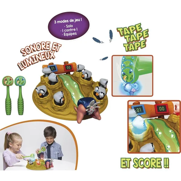 Contenu: 1 base avec des têtes d’autruches et 1 panneau des scores électronique + 2 marteaux à têtes de croco + 1 notice d’utilisation. De 1 à 4 joueurs.