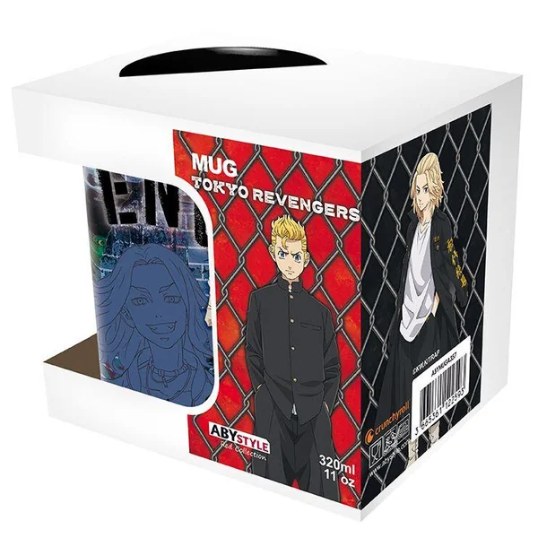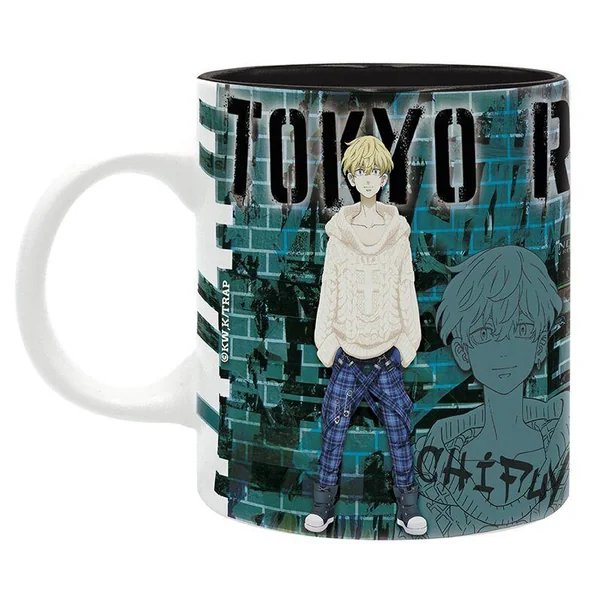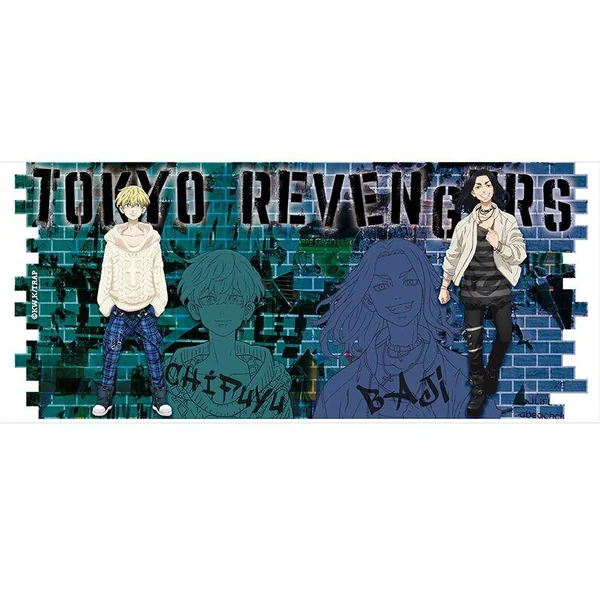 Sirotez votre café du matin avec vos capitaines préférés du gang Tokyo Maji avec ce mug Tokyo Revengers représentant le capitaine et le vice-capitaine de la première division, Baji et Chifuyu, sur un fond de briques avec leurs noms et leur logo dans une police de caractères graffiti.