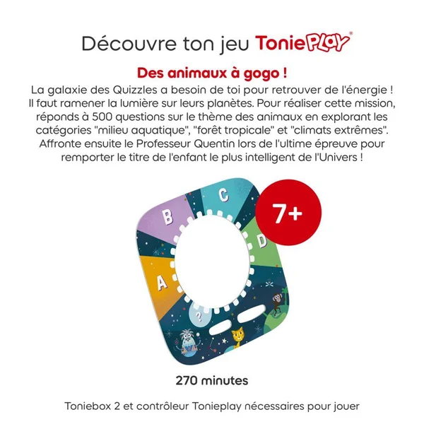 Inclus dans ce jeu : 1 disque Tonieplay « Les Quizzles : des animaux à gogo ! » et 4 cartes Quizzles