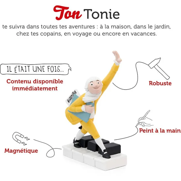 Avec votre figurine TONIES® Monsieur Mozart et votre TONIES®box (vendue séparément), Retrouvez le grand génie et une petite voix, trois larmes et dix rires, une sorcière et une amoureuse, des opéras du soir et une petite musique de nuit, un papillon et beaucoup d’étoiles.