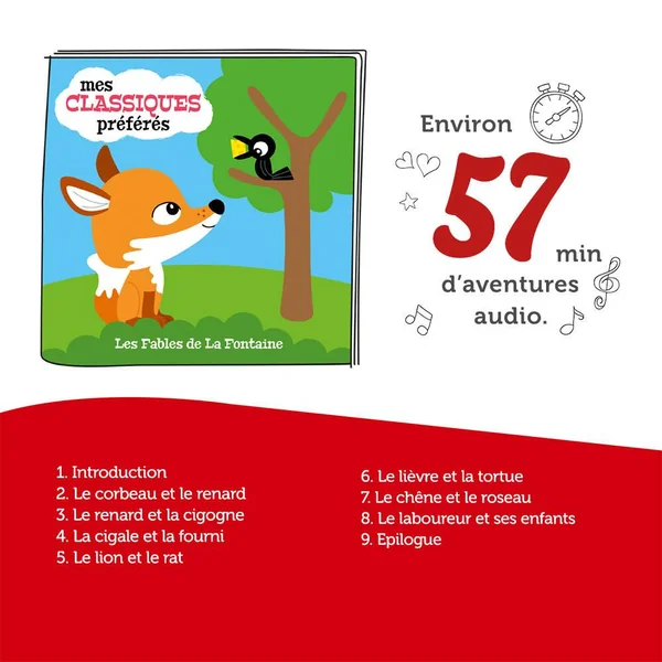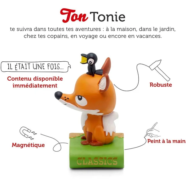 Avec votre figurine TONIES® Les Fables de la Fontaine et votre TONIES®box (vendue séparément), découvrez Les fables de La Fontaine expliquées grâce à des histoires ludiques et amusantes.