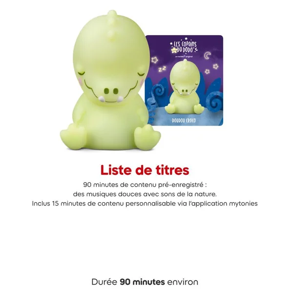 Une veilleuse toute douce, des musiques apaisantes et des messages personnalisés : Doudou Croco transforme le coucher en rituel rassurant.